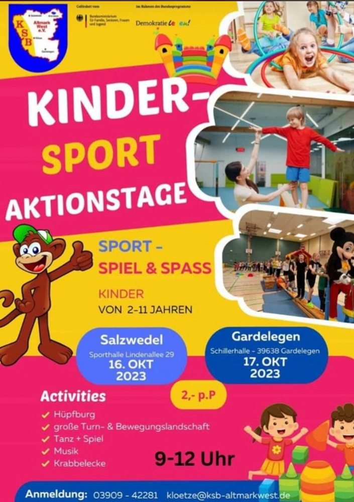 Kindersport-Aktionstag am 17. Oktober in Gardelegen Themen:SportVeranstaltung 11. Oktober 2023 Sport, Spiel und Spass am 17. Oktober in der Sporthalle Schillerstraße. Hüpfburg, Turn- und Bewegungslandschaft, Tanz und Spiel von 9.00 bis 12.00 Uhr. teilen teilen teilen